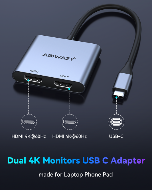 USB C to Dual HDMI Adapter 4K@60Hz, HDMI Splitter for Dual Monitors Extend Display, USB C HUB Multi Monitor Adapter to 2 HDMI Ports Converter for Dell XPS 13/15/17, HP, Lenovo, Surface Type C Laptop